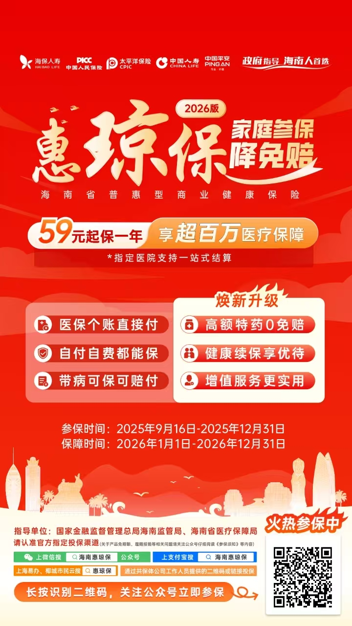 由政府引导管理的海南省2026版普惠商业健康保险“惠琼保”完全开放参与。该产品面向在海南省内办理居住证的海南主体医疗保险参保人员、海南户籍人员、海南身份证人员、在海南临时工作人员、海南省高层次人才认定人员、新人、新人、新人、新人、新人、新人、在职人员、新人、新人、新人, 就业人员、新人、就业人员、新人、新人、就业人员、新人、新人、新人、新人、新人、新人、新人、新人、新人、新人、雇主、新人、新人、新人、新人、新人、新人人、新人、新人、新人、就业人员。没有年龄、工作、户籍、健康状况的限制。参保人群涵盖范围广泛。