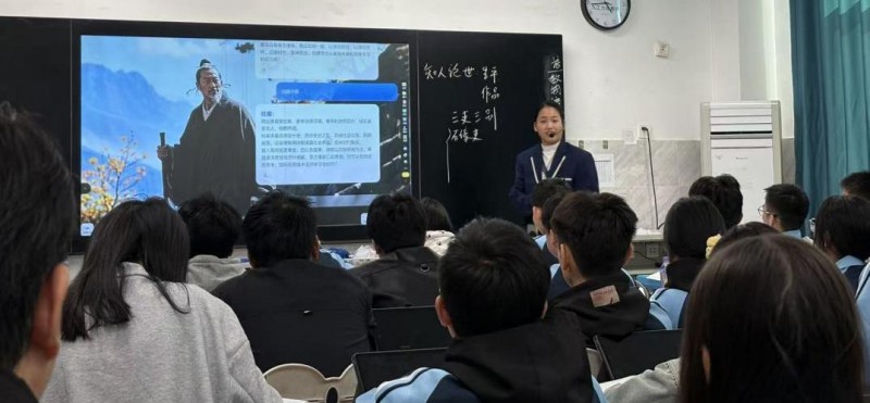 语文老师王爱珠给新生班讲授《up》。通过智慧课堂,老师在入门阶段就带出“全班连线”,检查文献知识,引导学生讨论答案,这与传统的教学方式有很大不同;与此同时,老师在课堂上推出了“讨论”活动,全班同学通过智能平板表达自己的观点。通过“词云”展示主要风景,学生的课堂生成一目了然;最精彩的是老师设计的虚拟人(杜甫)对话情景非常巧妙,有效提升了学生学习古诗词的兴趣,拓展了学生“认识人、分析世界”的学科思维。