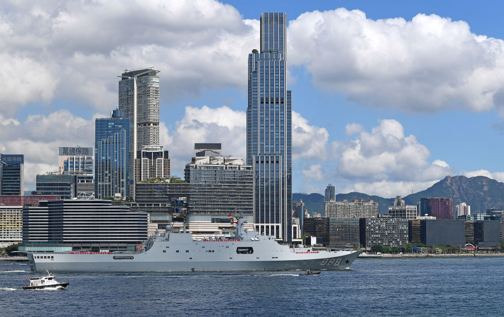 10月3日,中国海军的赋明山船航行了香港的维多利亚港。新华社记者陈Duo摄
